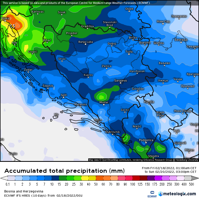 Od ranih jutarnjih sati nedjelje (20.02.) pa do nedjelje poslijepodne slijedi premještanje padavina sjeverozapada dalje na ostatak zemlje. Po prestanku padavina u nedjelju ujutro i prijepodne smanjenje oblačnosti na sjeverozapadu i sjeveru Bosne, a kasnije u nastavku dana odmicanjem padavina razvedrit će se u cijeloj zemlji.