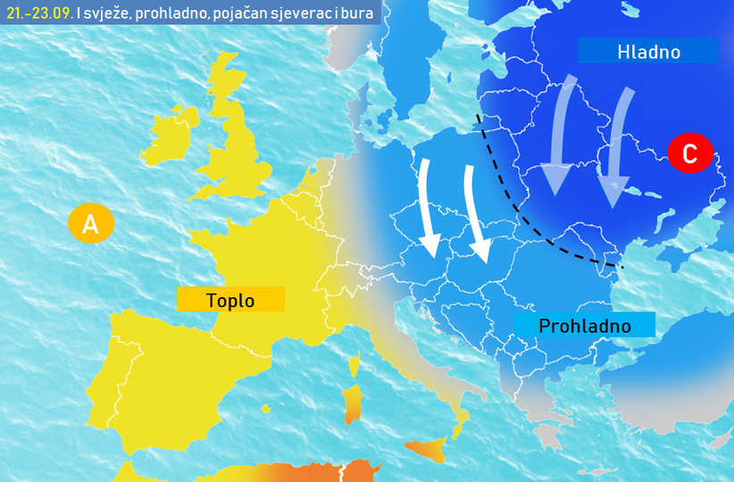 Narednih nekoliko dana (21.-23.09.) nalazićemo se pod uticajem hladne vazdušne mase sa područja istoka Evrope sto će nam donijeti hladnije vrijeme od prosjeka.