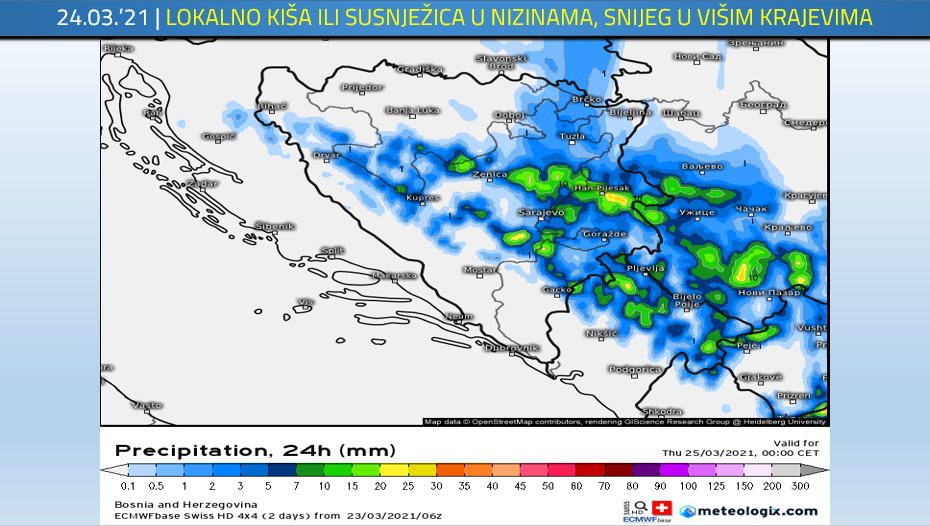 Bit će i lokalno padavina, većinom slabih, nešto jače na planinama. Očekuju se uglavnom nad centralnim, sjeveroistočnim, istočnim, jugoistočnim dijelovima Bosne, drugdje samo ponegdje.