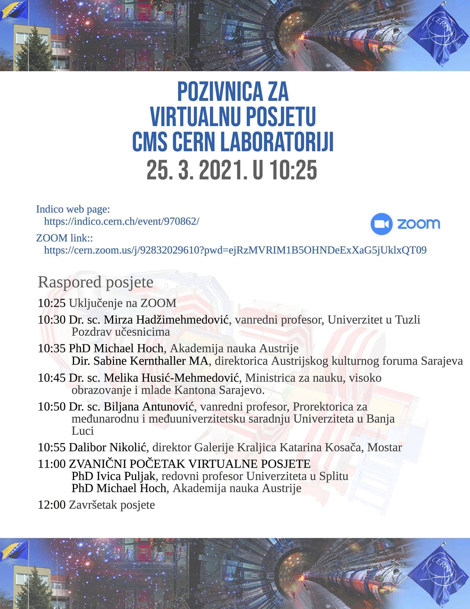 Sutra, odnosno u četvrtak, 25. marta 2021 godine, možete da budete dio virtualne posjetu CMS eksperimentu na CERN-u. Program počinje u 10:25, a posjeta je od 11 do 12 časova.