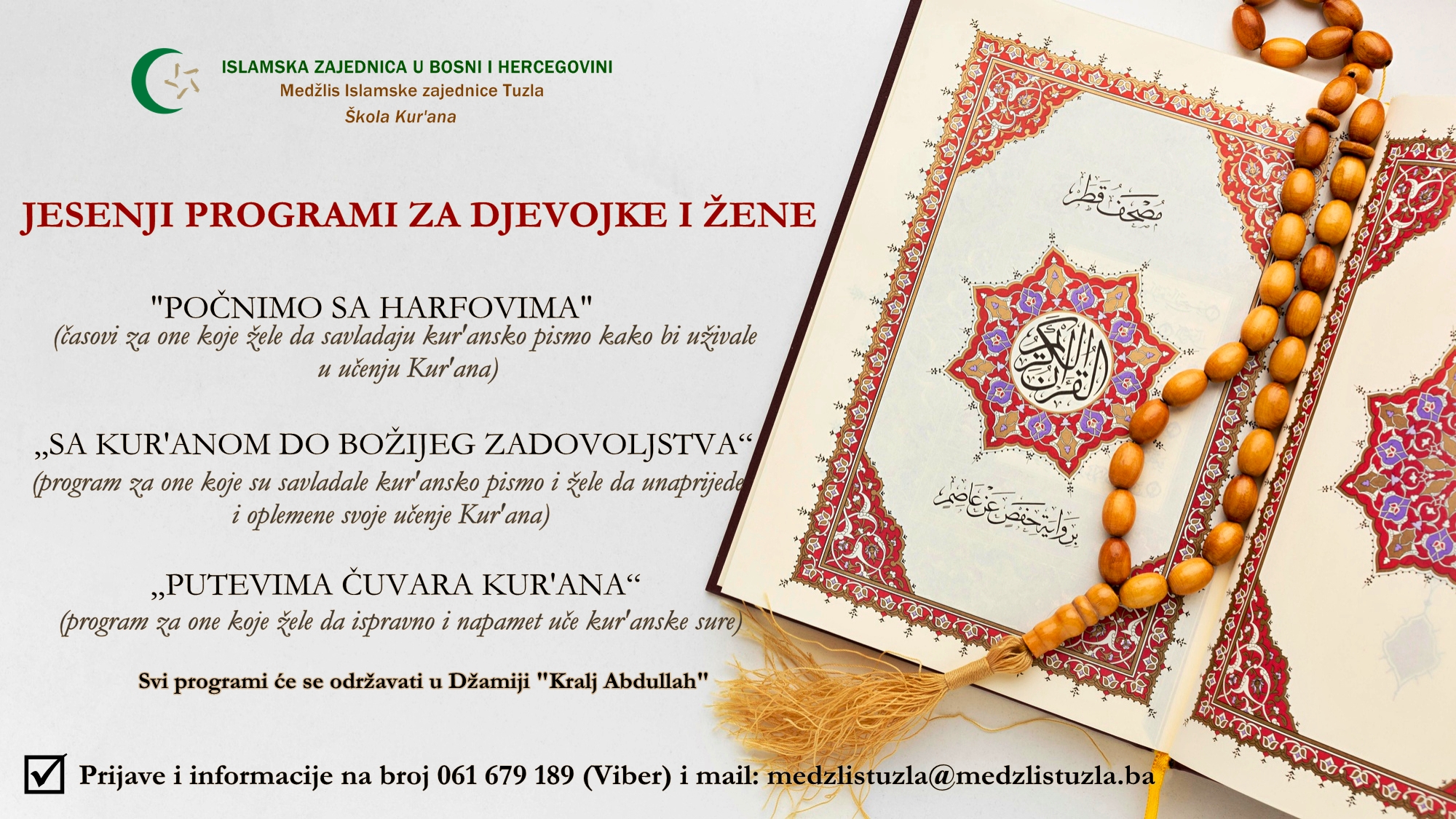 Škola Kur’ana Medžlisa Islamske zajednice Tuzla otvara poziv za polaznice na jesenje programe za djevojke i žene.