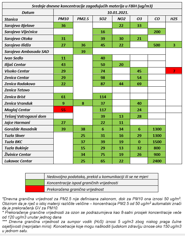 Kvalitet zraka posljednja dva dana je bio zadovoljavajući – relativno čist do umjereno zagađen zrak bio je prisutan na mjernim mjestima u Federaciji Bosne i Hercegovine.
