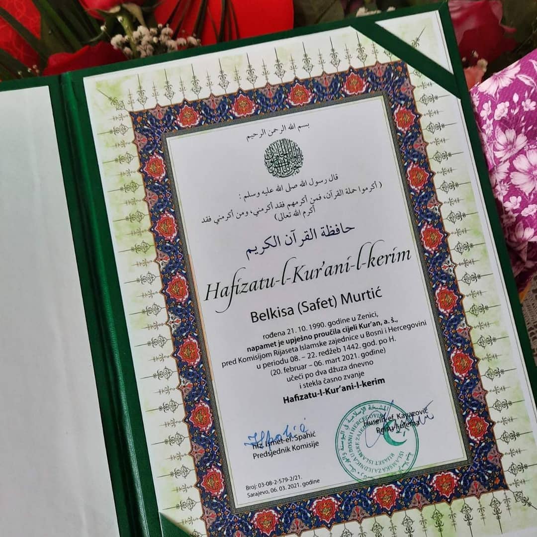 Priznanje za Belkisin hifz stigao je u vidu diplome od strane dr. hfz Dževada Šošića, koji je čestitao hafizi, njenom muhafizu, Medžlisu i Muftijstvu, prilikom dodjela diplome u Ensar džamiji, u džematu Babina rijeka.