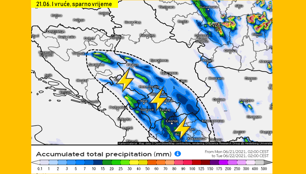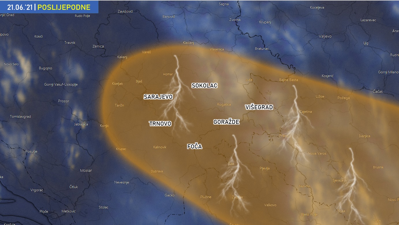 Poslijepodne razvojem oblačnosti u dijelovima centralne i istočne Bosne mogući su lokalno jaki pljuskovi i grmljavina! Postoji opasnost i za pojavu grmljavinskog nevremena uz obilnu kišu, jak vjetar i led.