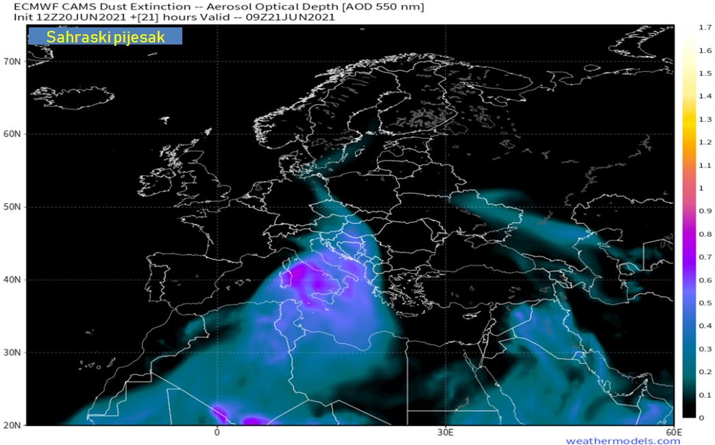 Od sutra (21.06.) idemo pod okrilje afričkog vrućeg zraka koji će nam donijeti neugodan i dosta vreo sutrašnji dan ali i dane poslije.